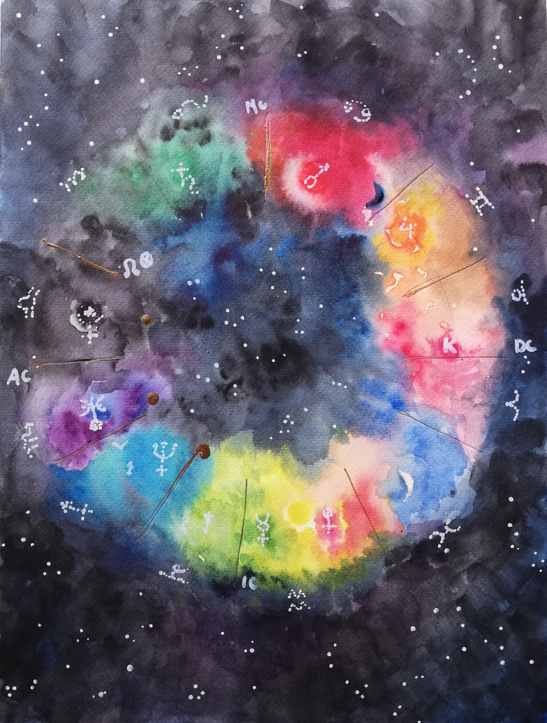 Si quieres tener una imagen del cielo cuando naciste y sabes la hora aproximada, puedes encargarla aquí. Buscaré la situación de los planetas en tu nacimiento y realizaré una acuarela que los represente en el círculo de las constelaciones zodiacales, utilizando los colores de cada planeta.
